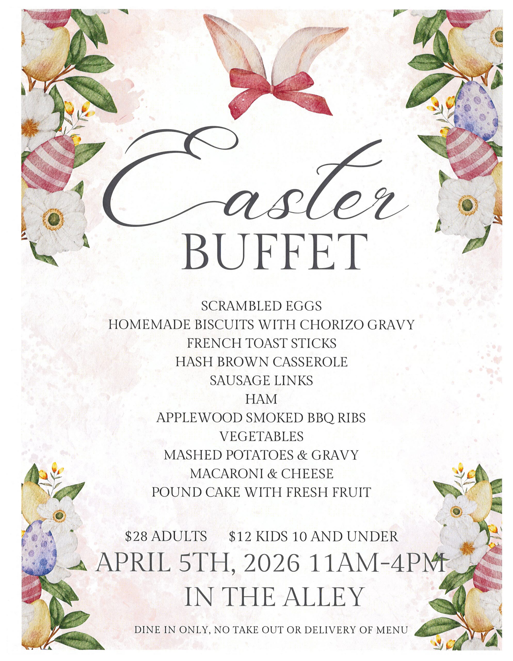 Easter Buffet – The Alley. 11am- 4pm. Scrambled Eggs / Homemade Biscuits with Chorizo Gravy / French Toast Sticks / Hash Brown Casserole / Sausage Links / Ham/ Applewood Smoked BBQ Ribs / Vegetables / Mashed Potatoes & Gravy / Macaroni & Cheese / Pound Cake with Fresh Fruit. $28 Adults. $12 Kids 10 and under. 806 Main St W. Click this link for the Menu https://www.visitashland.com/wp-content/uploads/DeepwaterEasterPoster-scaled.jpg - 04/05/2026