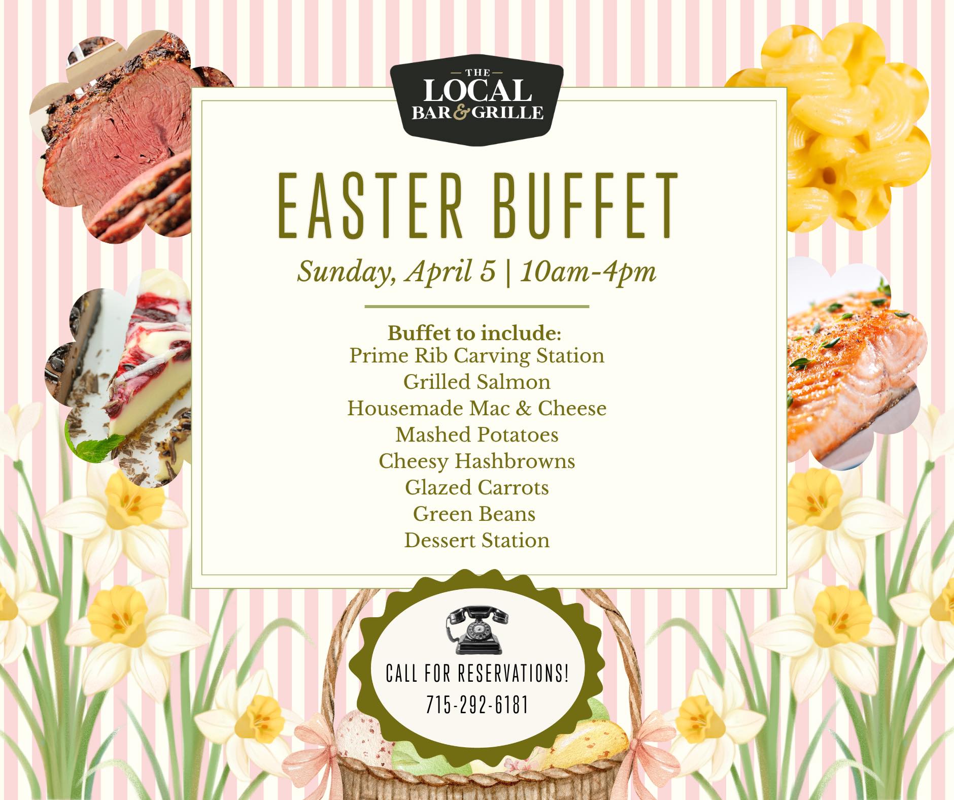 Easter is right around the corner! Join us at The Local for our Easter Buffet on Sunday, 10am-4pm! We’re bringing out all the favorites plus a few showstoppers! Think carved prime rib, grilled salmon, creamy mac and cheese, cheesy hashbrowns, and a full dessert station that might just steal the spotlight. There may even be a surprise guest that will “hop” in for a visit! Whether you’re coming with family, friends, or just showing up hungry, we’ve got your table waiting. $34 for adults | $17 for kids. Menu https://www.visitashland.com/wp-content/uploads/TheLocalEaster26.jpg Reservations are highly recommended! 715-292-6181. Let us do the cooking & the cleaning this year! You just show up and enjoy! 3000 Golf Course Rd - 04/05/2026