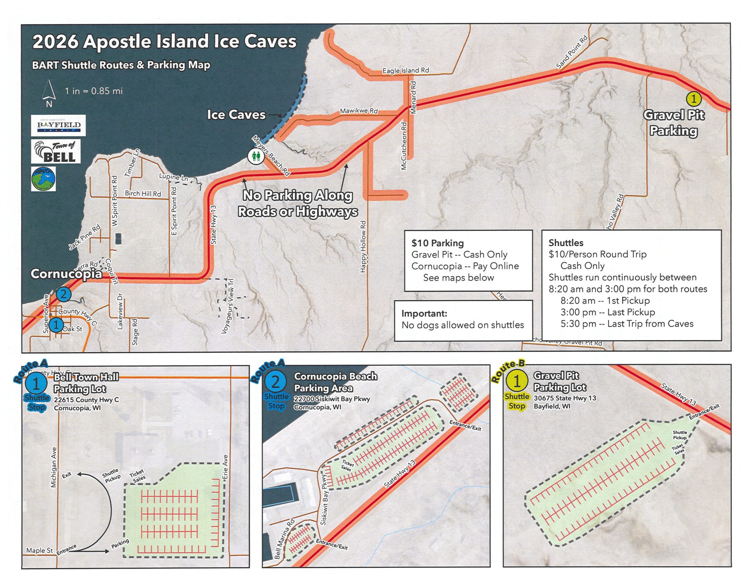There is no parking at Meyers Beach ice caves trailhead or on nearby Hwy 13. Vehicles parked on closed roadways may be towed. Visitors must use county-managed shuttles (Bay Area Rural Transit) and off-site parking lots which are not operated by the National Park Service. Expect delays and congestion. Shuttle and parking fees apply. First shuttle drop off at Meyers Beach is at 8:30am. Last shuttle drop off at 3:00pm. Last shuttle pickup is at 5:30pm. Shuttles will run approximately every 25-35 minutes. Congestion and delays are possible. $5 each way, $10 round trip, cash only.